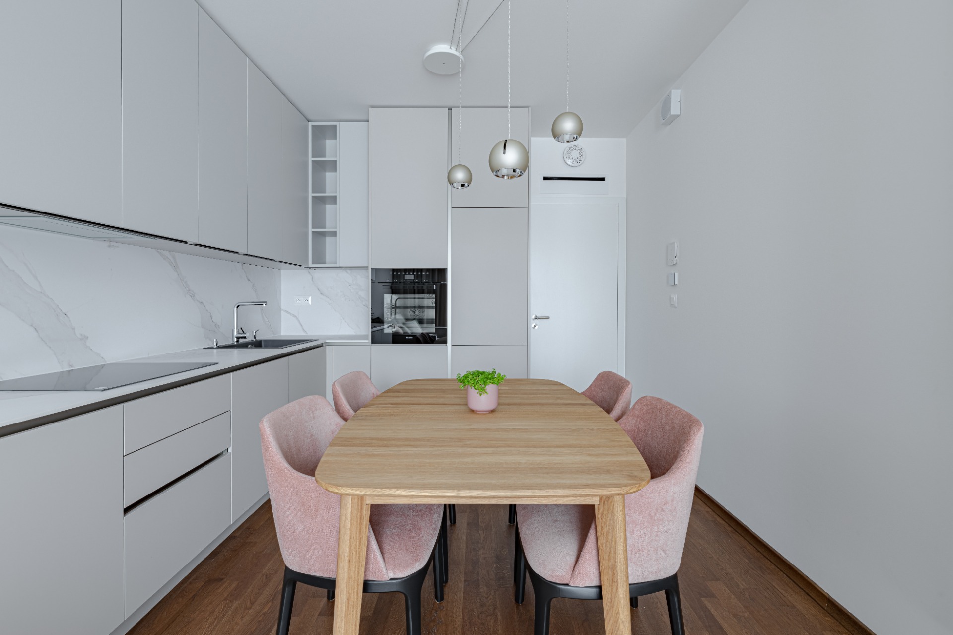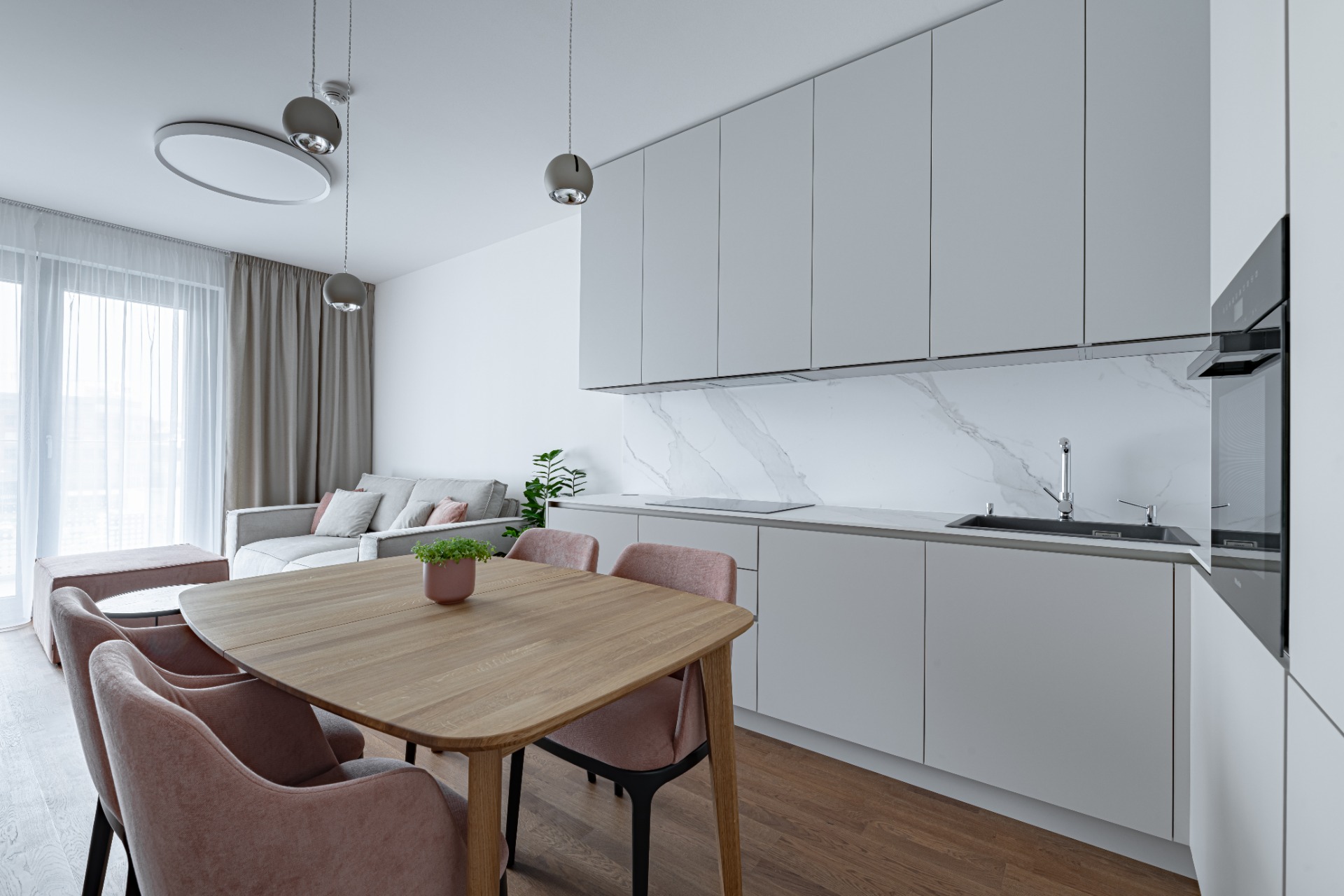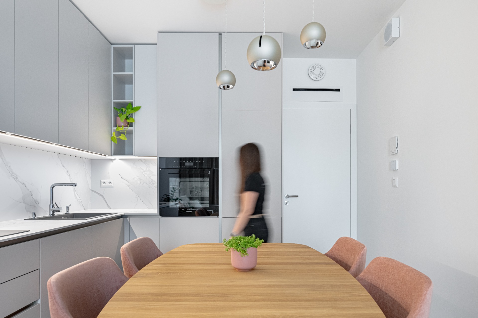V projekte Metropolis v novom centre Bratislavy sme navrhli útulný 2-izbový byt, ktorý spája premyslenú dispozíciu s elegantným vizuálnym riešením. Byt ponúka vstupnú halu, kúpeľňu, samostatnú toaletu s práčovňou a dve nepriechodné izby. Priestranná spálňa poskytuje dostatok úložného priestoru aj miesto na pracovný stôl. Srdcom bytu je kompaktná, no funkčne vyriešená 20 m² veľká denná zóna, ktorá spája obývačku, kuchyňu a jedálenský kút. Svetlé tóny, jemné kontrasty materiálov a dotyk lososovej farby prinášajú do interiéru pokoj a ženskosť, zatiaľ čo praktické riešenie kuchyne a obývačky zaručuje pohodlie v každodennom živote. Elegantný mramor v kombinácii s lososovou a krémovosivou paletou vytvára svieži akcent a harmonickú atmosféru, ktorá sa prirodzene nesie celým bytom.