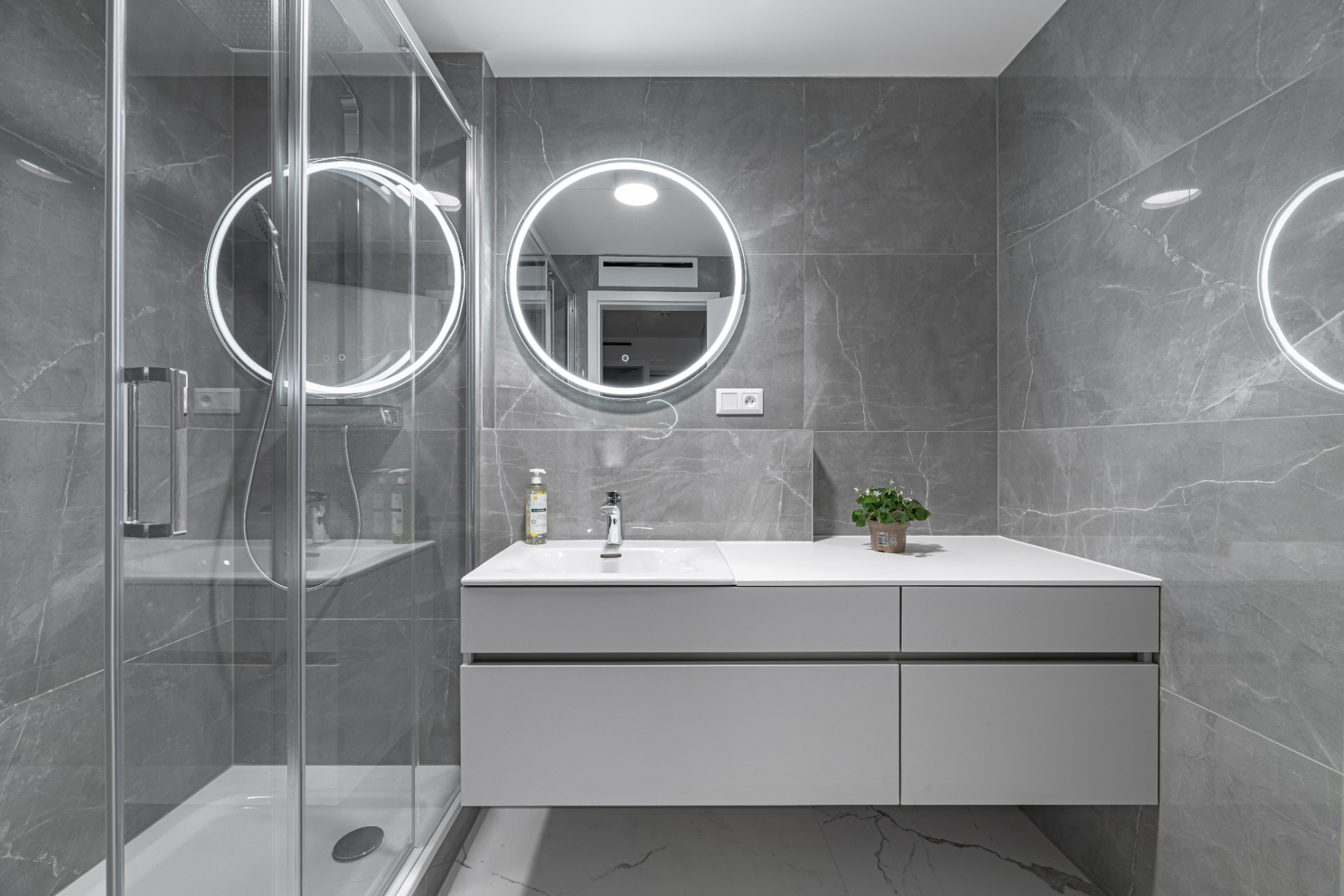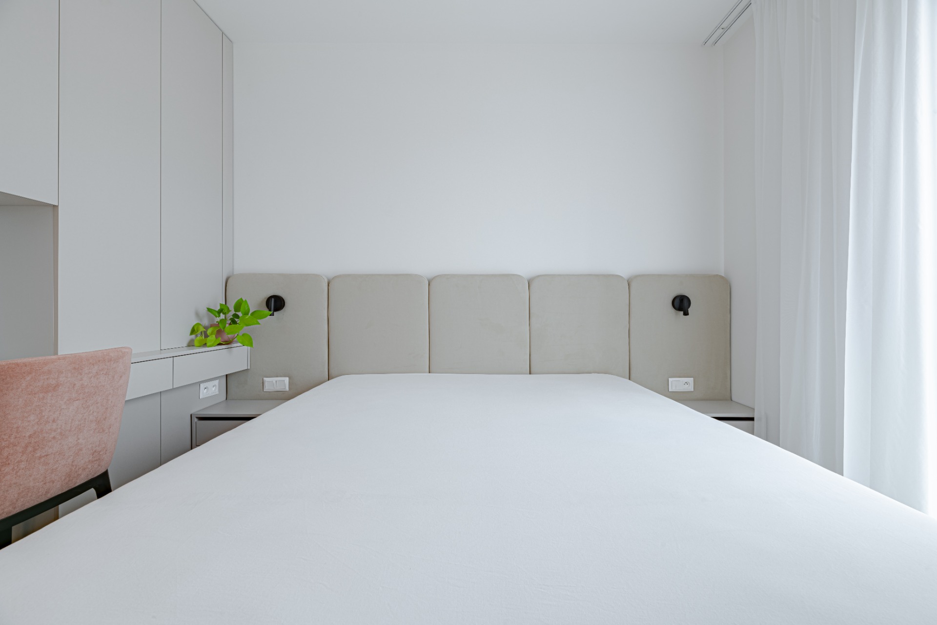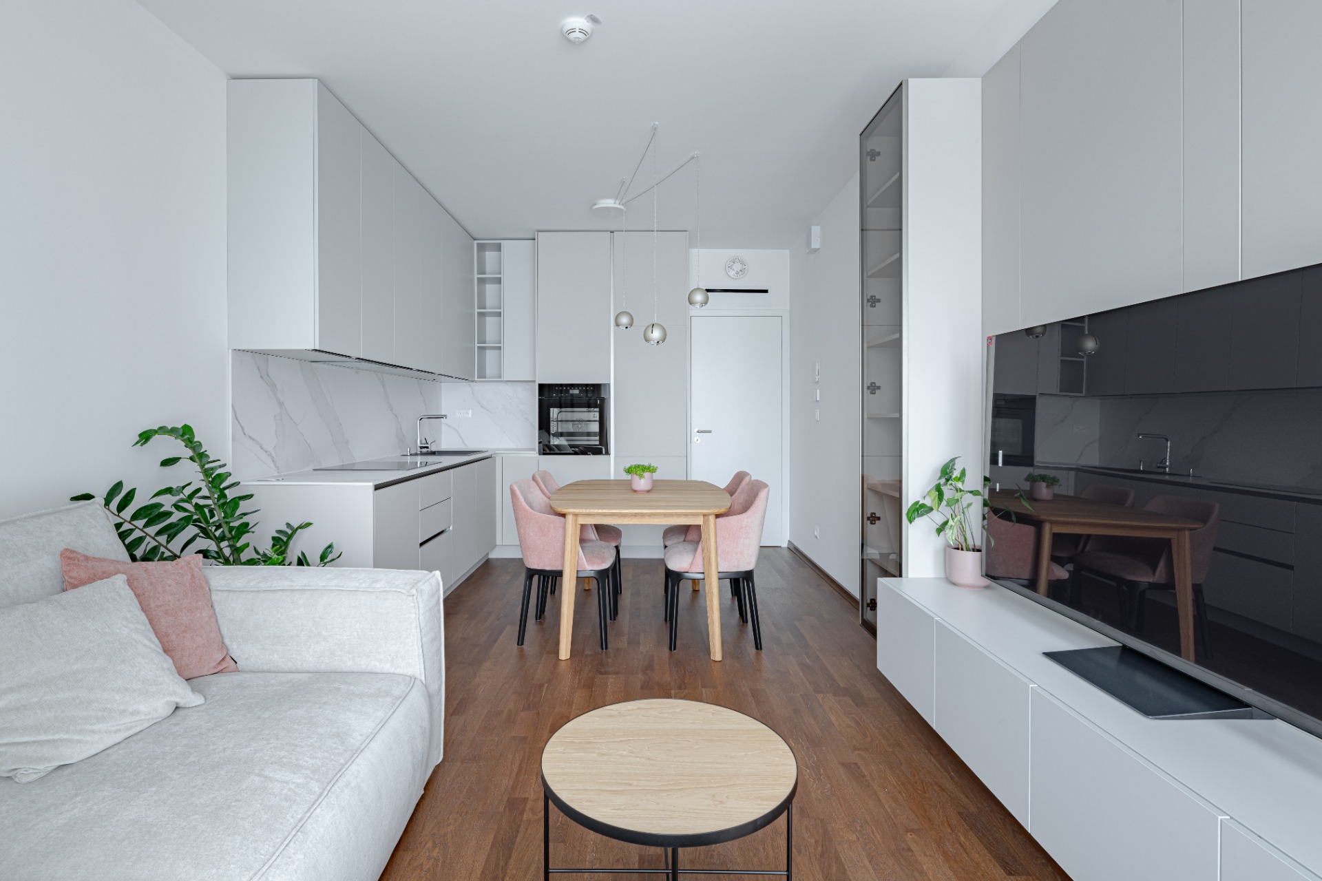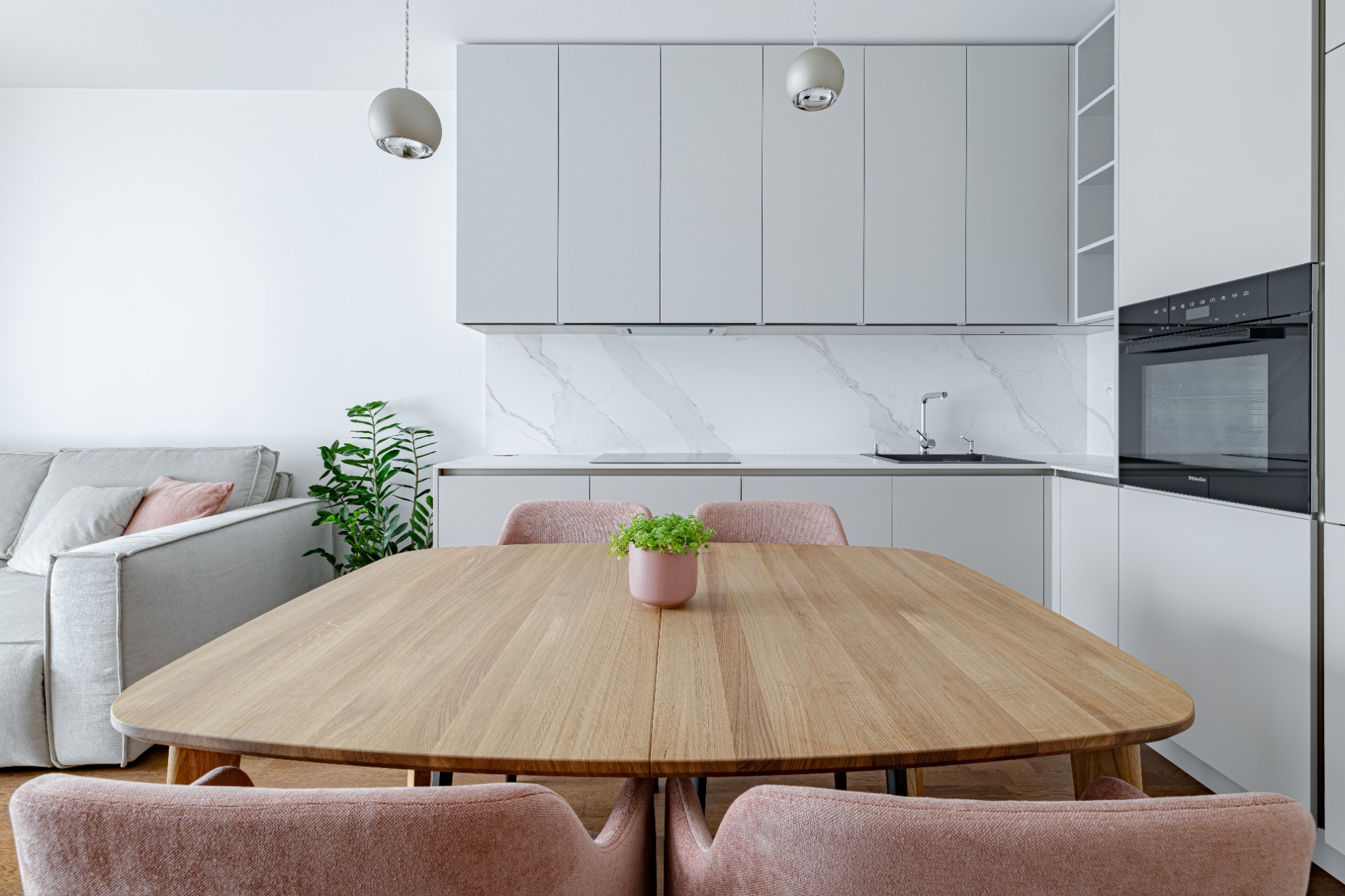 V projekte Metropolis v novom centre Bratislavy sme navrhli útulný 2-izbový byt, ktorý spája premyslenú dispozíciu s elegantným vizuálnym riešením. Byt ponúka vstupnú halu, kúpeľňu, samostatnú toaletu s práčovňou a dve nepriechodné izby. Priestranná spálňa poskytuje dostatok úložného priestoru aj miesto na pracovný stôl. Srdcom bytu je kompaktná, no funkčne vyriešená 20 m² veľká denná zóna, ktorá spája obývačku, kuchyňu a jedálenský kút. Svetlé tóny, jemné kontrasty materiálov a dotyk lososovej farby prinášajú do interiéru pokoj a ženskosť, zatiaľ čo praktické riešenie kuchyne a obývačky zaručuje pohodlie v každodennom živote. Elegantný mramor v kombinácii s lososovou a krémovosivou paletou vytvára svieži akcent a harmonickú atmosféru, ktorá sa prirodzene nesie celým bytom.