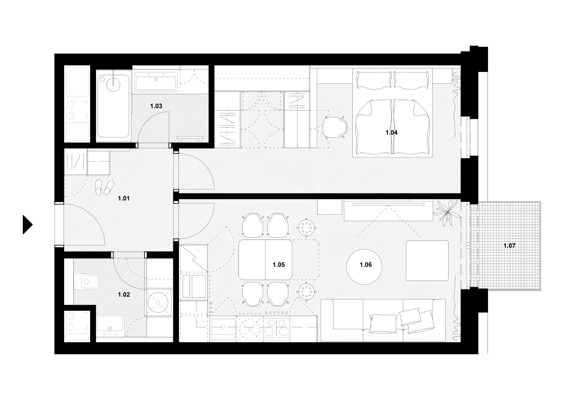 V projekte Metropolis v novom centre Bratislavy sme navrhli útulný 2-izbový byt, ktorý spája premyslenú dispozíciu s elegantným vizuálnym riešením. Byt ponúka vstupnú halu, kúpeľňu, samostatnú toaletu s práčovňou a dve nepriechodné izby. Priestranná spálňa poskytuje dostatok úložného priestoru aj miesto na pracovný stôl. Srdcom bytu je kompaktná, no funkčne vyriešená 20 m² veľká denná zóna, ktorá spája obývačku, kuchyňu a jedálenský kút. Svetlé tóny, jemné kontrasty materiálov a dotyk lososovej farby prinášajú do interiéru pokoj a ženskosť, zatiaľ čo praktické riešenie kuchyne a obývačky zaručuje pohodlie v každodennom živote. Elegantný mramor v kombinácii s lososovou a krémovosivou paletou vytvára svieži akcent a harmonickú atmosféru, ktorá sa prirodzene nesie celým bytom.
