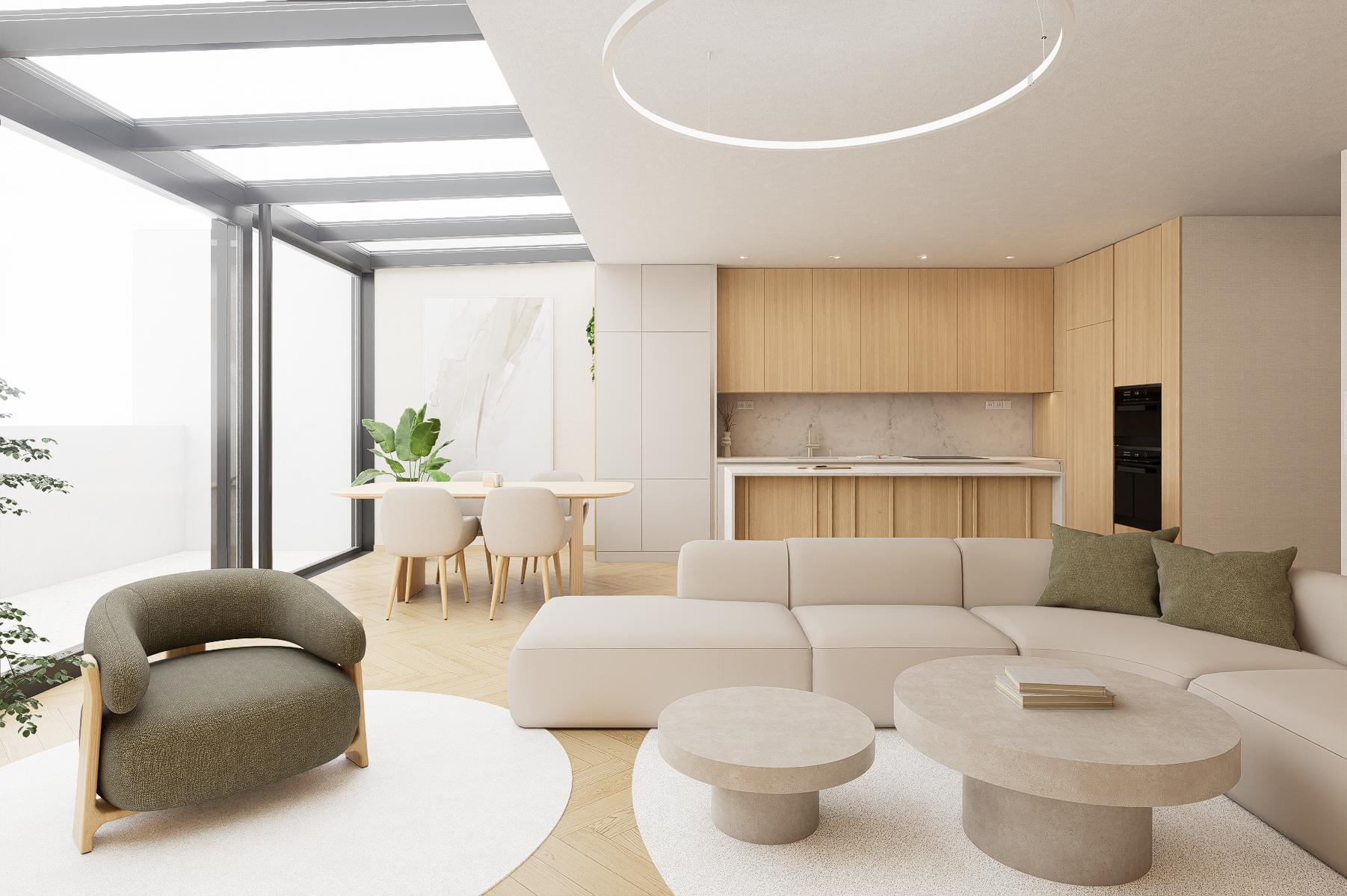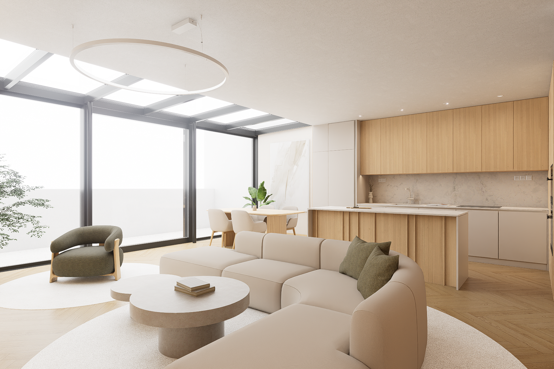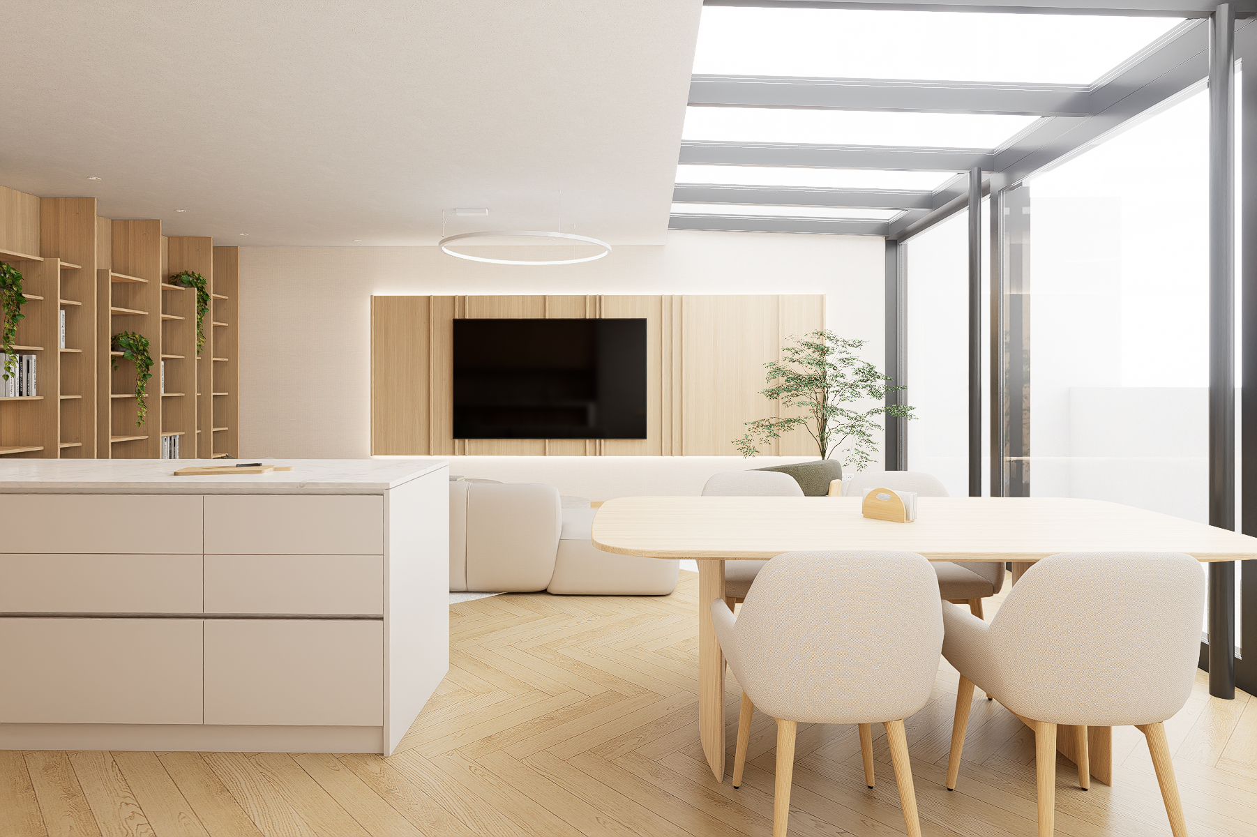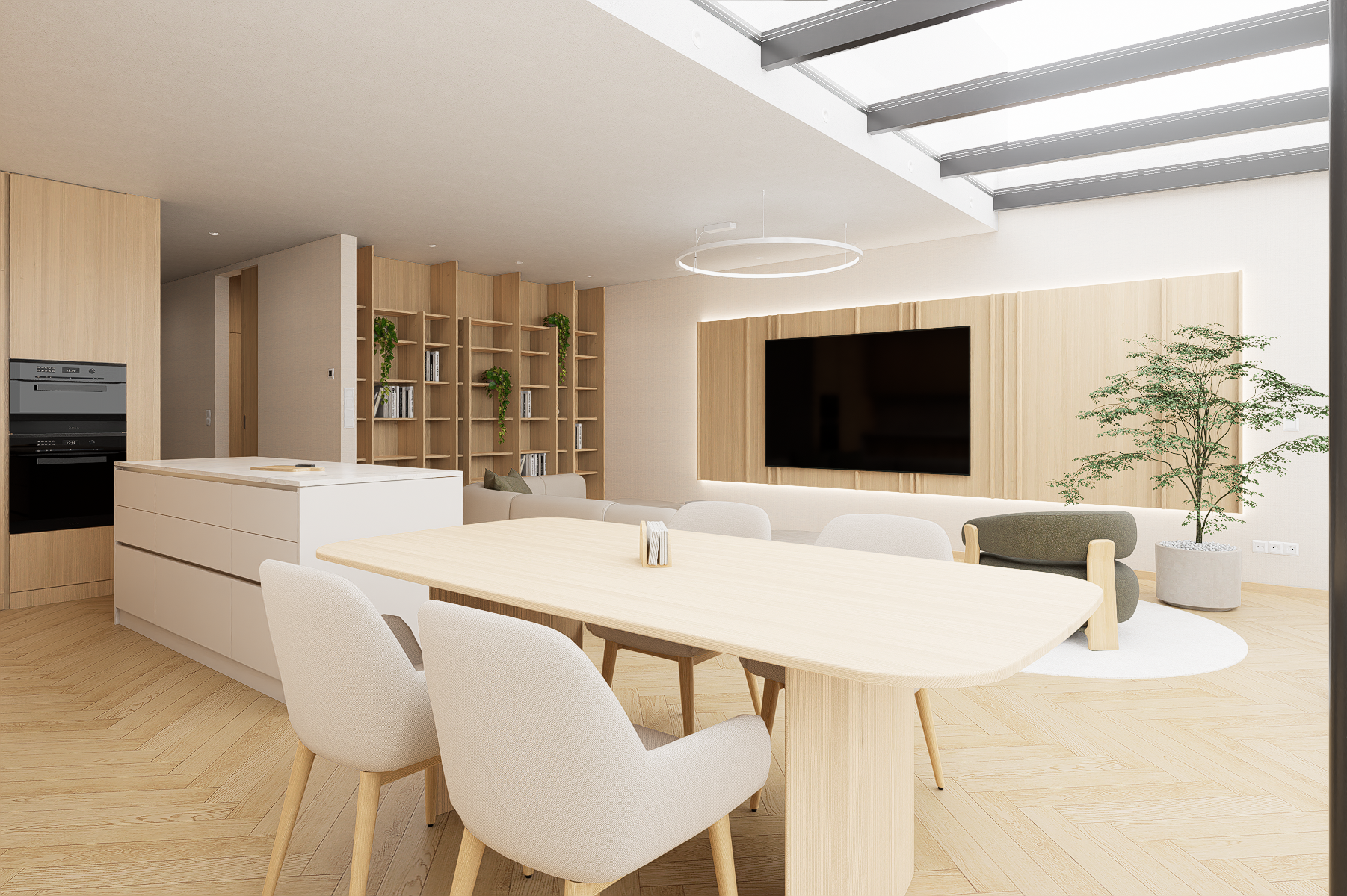 V Ružomberku sme navrhli 4-izbový byt s atypickou dispozíciou, ktorá definovala celý koncept interiéru. Najvýraznejším prvkom je obývacia časť s preskleným stropom, pripomínajúca zimnú záhradu. Tento architektonický prvok prináša do priestoru nadštandardné množstvo denného svetla a vytvára jedinečnú atmosféru počas celého dňa.