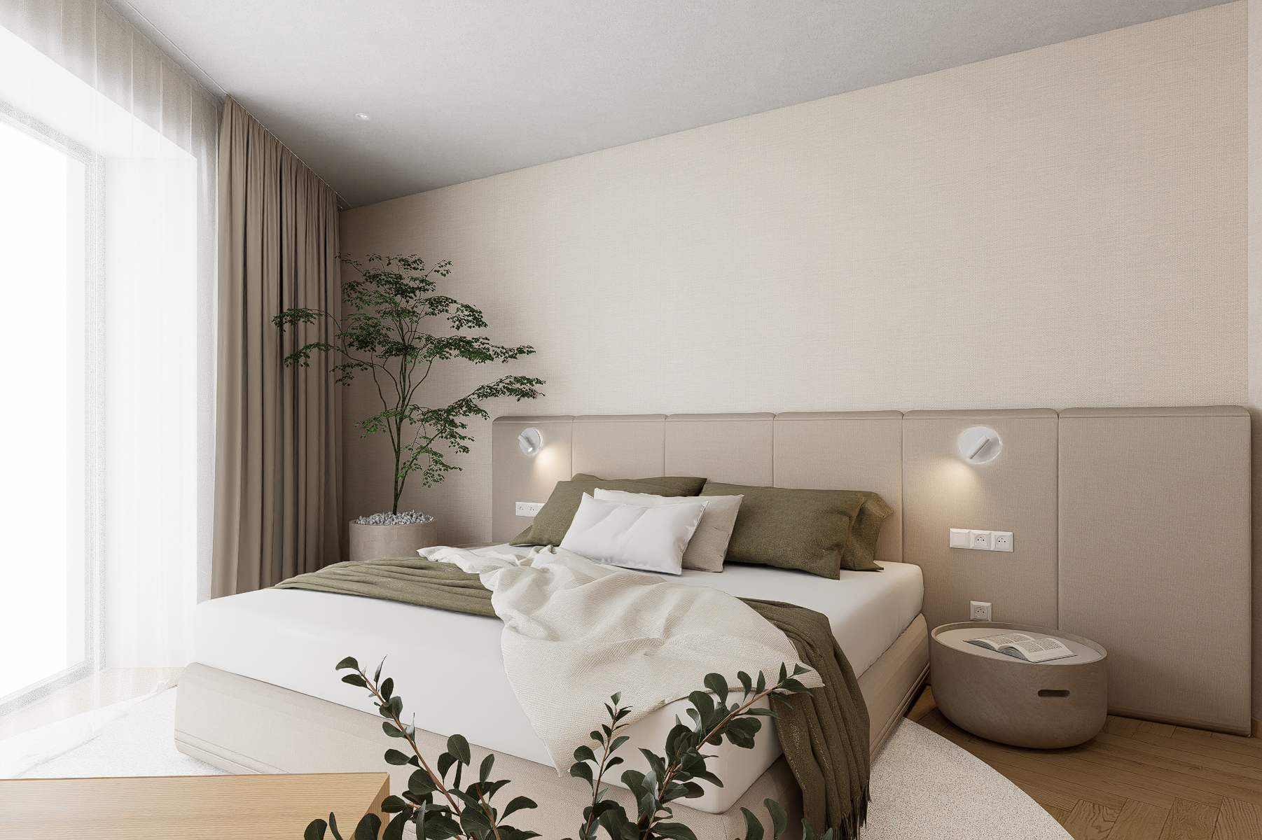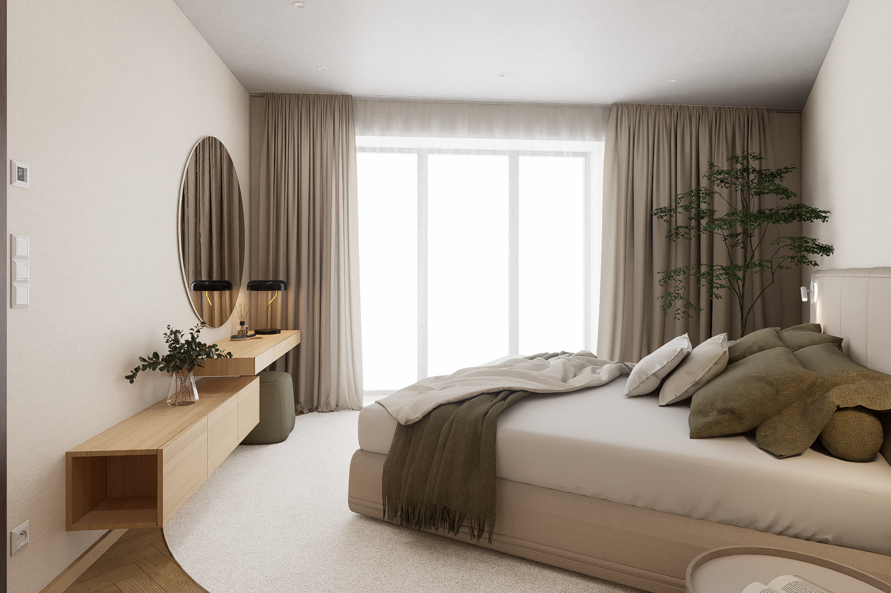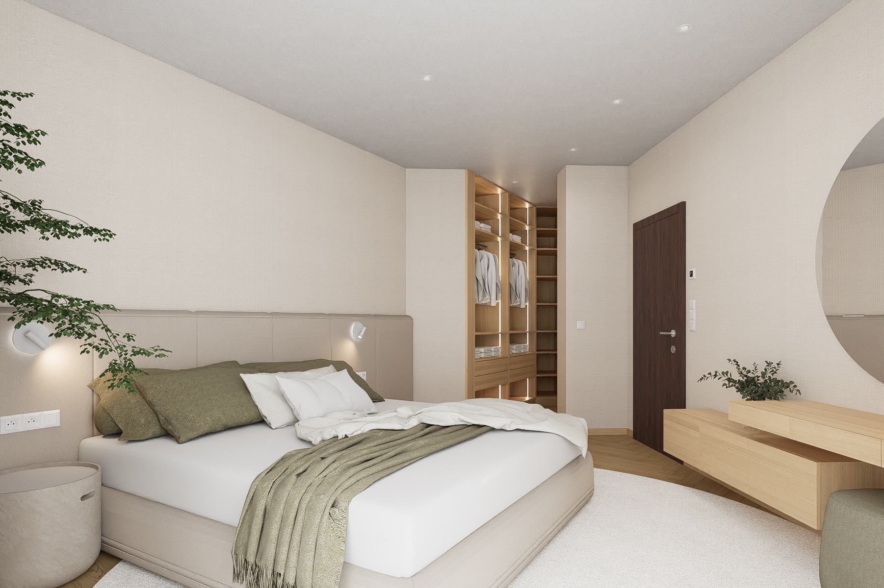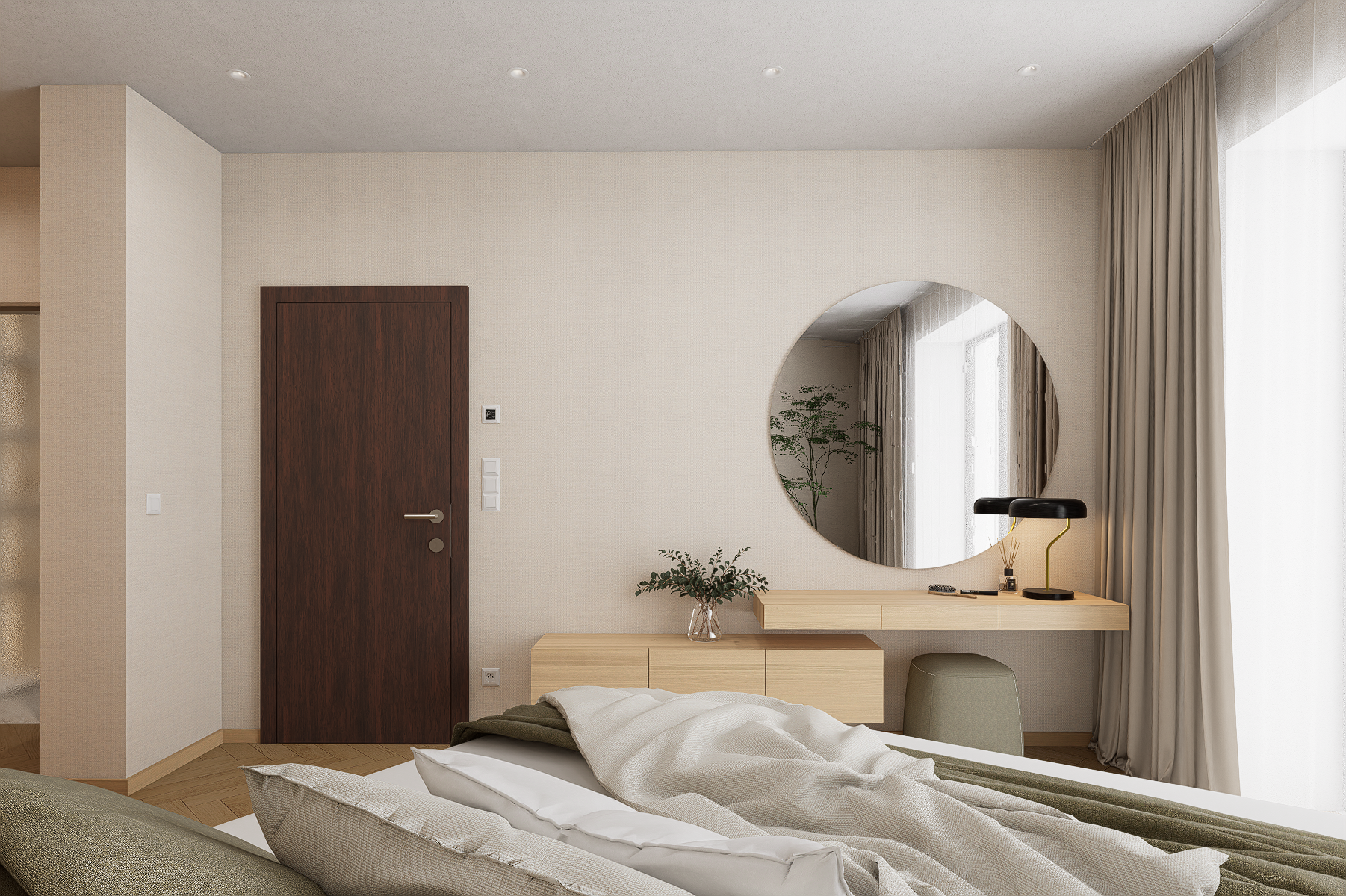 Materiálovo je interiér ladený do zemitých tónov v kombinácii s drevodekorom, ktorý prináša do bytu prirodzenosť a teplo. Farebnú kompozíciu dopĺňajú tmavozelené akcenty, ktoré dodávajú priestoru hĺbku a eleganciu. Podlahu tvorí drevený vzor v rybej kosti, ktorý podčiarkuje celkový charakter interiéru.